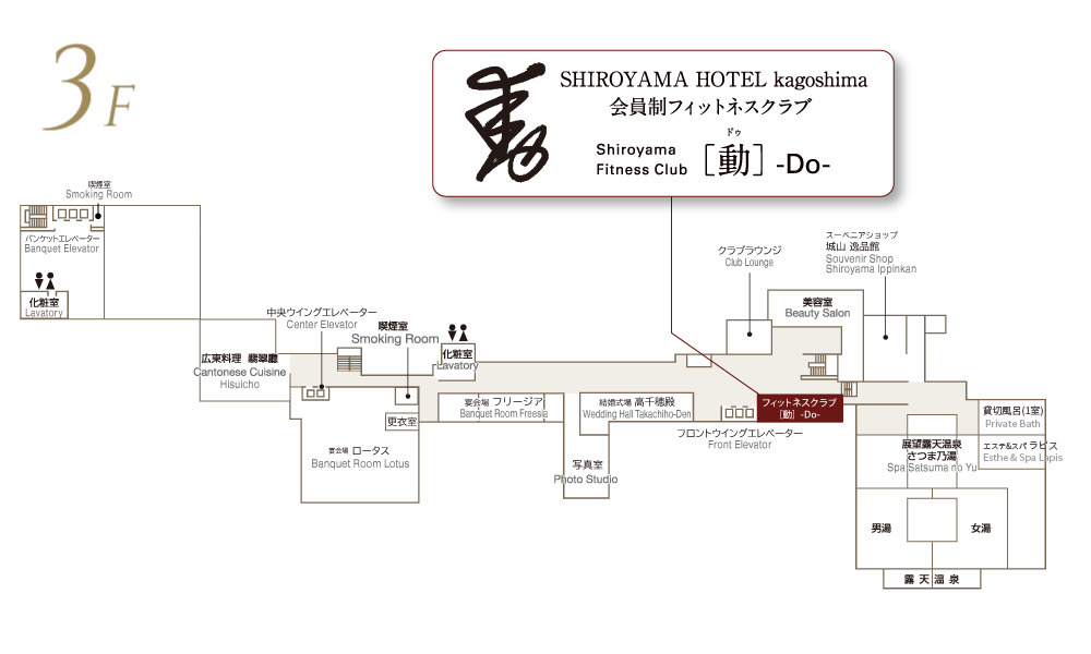 「Shiroyama Fitness Club 動 -Do-」は、SHIROYAMA HOTEL kagoshimaのフィットネスクラブです。健康という基本的かつ、かけがえのない価値を、 創業50年を超えるSHIROYAMA HOTEL kagoshimaのサービスクオリティでご提案いたします。 私たちの理念である「幸せを、かさねていける場所」。それは、体験のご提供だけでなく、健康面においてもそうでありたいと考えています。 国内はもちろん、年々増えている海外からのお客さまにも日本、そして鹿児島の歴史や伝統文化を感じていただくため、フィットネスジムのさまざまな箇所に「和」をイメージさせる意匠が散りばめられています。墨書きの特徴的なシンボルマークは、「真行草」のうち「草」の思想をもとに、人の動く流れを一筆で表現しています。
