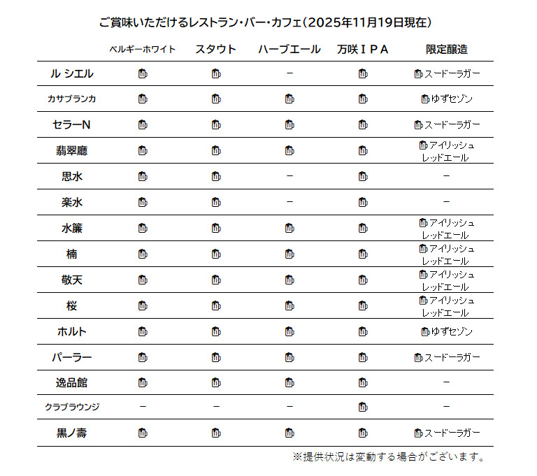 城山ブルワリーは、各レストラン、Souvenir Shop Shiroyama 逸品館でお飲みいただけます。*工場ではお飲みいただけません。