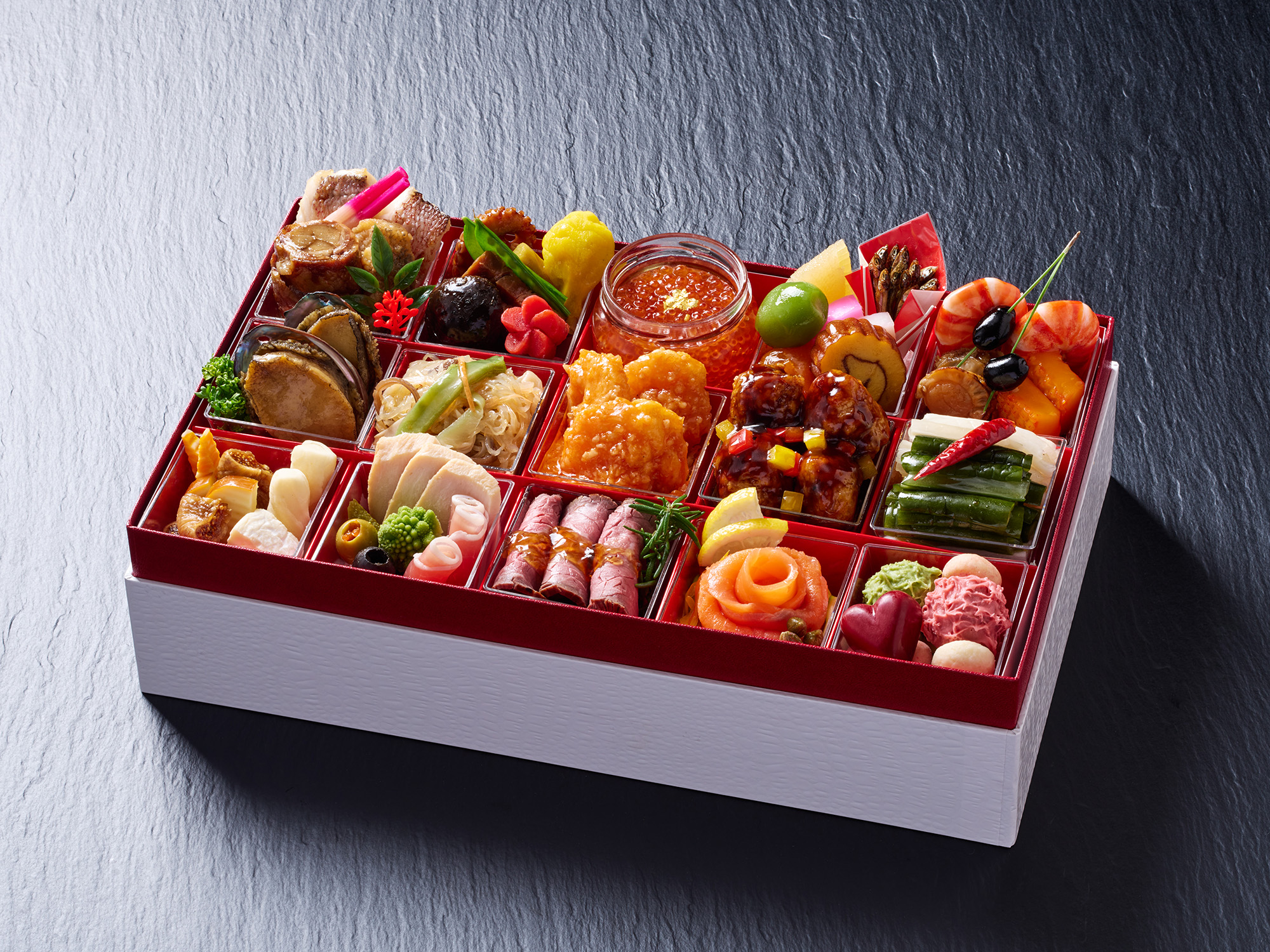 和・洋・中それぞれの料理長が厳選した食材と磨き抜いた技を一段ずつに込め華やかなおせちに仕立てました。