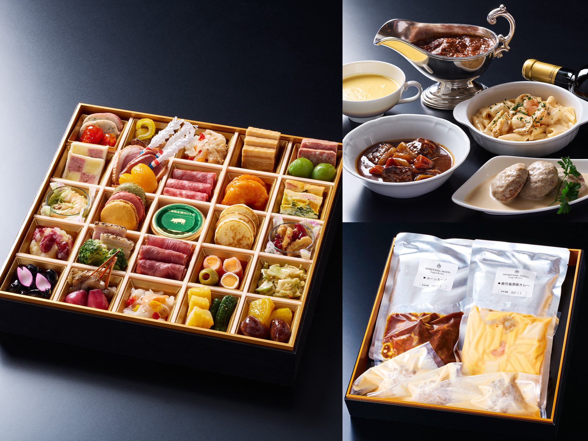 SHIROYAMA HOTEL kagoshima 総料理長監修、厳選した食材と繊細な技で仕立てた「ビストロおせち一段重」と、温めるだけで本格的な味わいが楽しめる洋食メニューを組み合わせたプレミアムセットが新登場。スタイリッシュで華やかなおせちと芳醇な香り漂う温製洋食を贅沢なミニコース仕立てでご堪能いただけます。