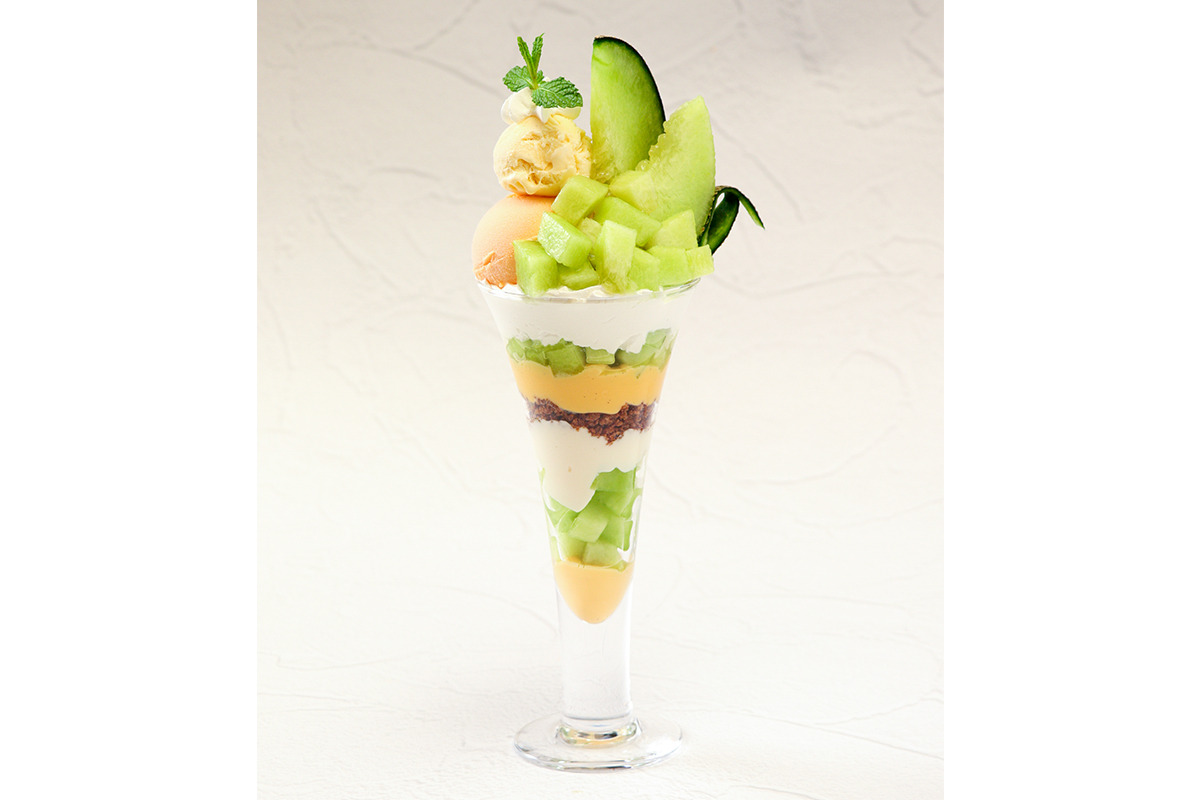 静岡クラウンメロンを、クリームと冷たいアイスで仕上げた贅沢なパフェ。
