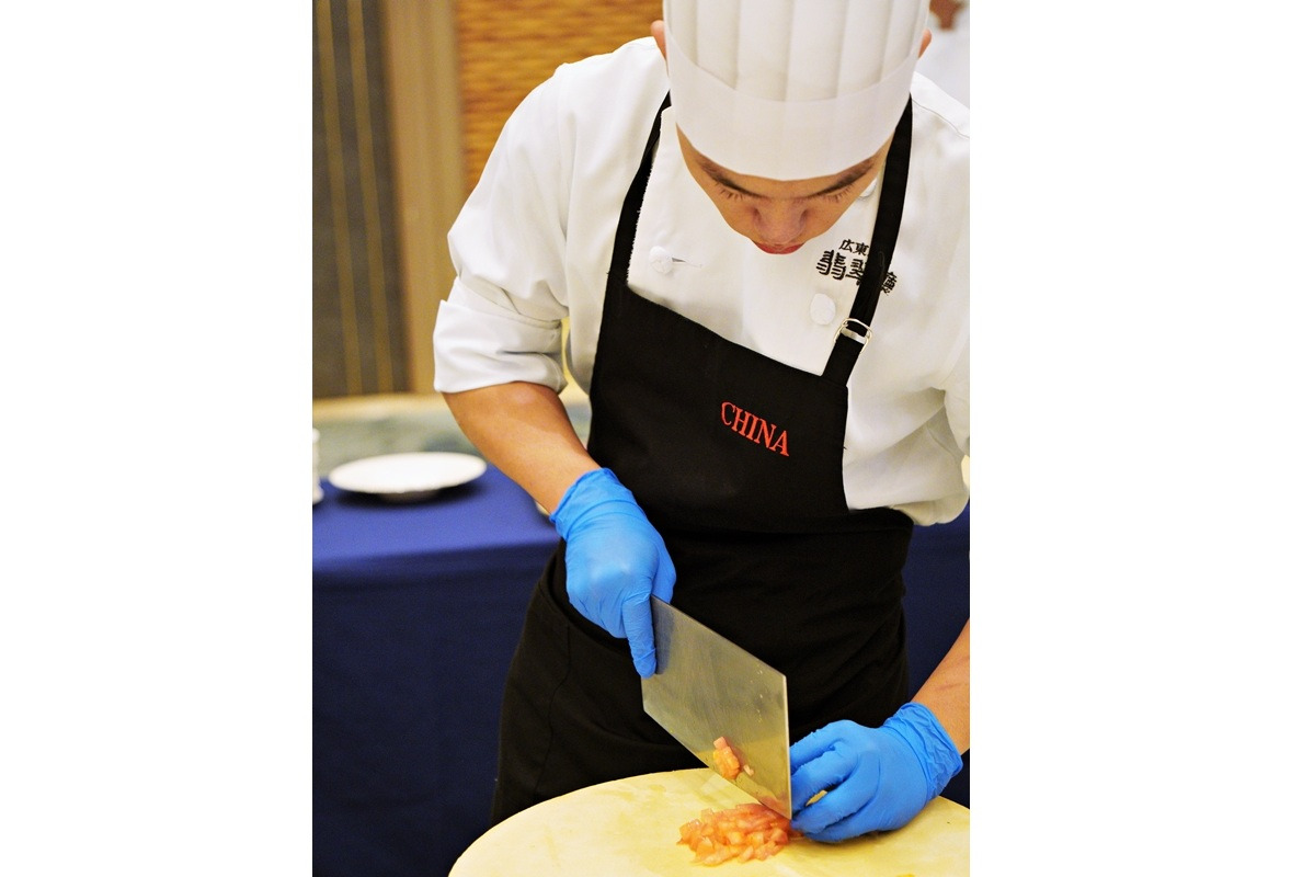 緊張でピンと張りつめた空気の中、調理部門の一番手を務める選手が10時45分に調理をスタート。その後、順次5分遅れで調理に取り掛かり、7名が制限時間1時間で仕上げていきます。