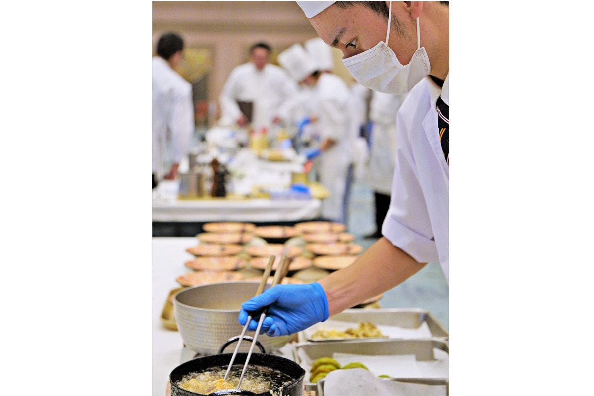 ジュージュー、パチパチ、ジュワジュワといった弾む音と、バターと醤油、ニンニクの香りなど。調理場が別でふだん交わることのない、和食、洋食、中華の美味を追求する音と香りが会場を豊かに満たしていきました。