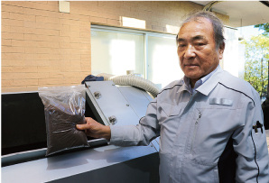 ホルトの裏に設置した生ごみを堆肥化する機械は、一度に生ごみを100ℓ処理できる優れもの。約8~9時間でサラサラの粉状に変わります。処理機を開発した(株)修電舎の一瀬直行会長によると、出来上がった堆肥は土に帰すと、菌の好気性から眠っていた菌が動き出し土壌を活性化させるとのこと。この堆肥で土壌を健康に保ち、農薬や化学肥料を使うことなく、安心安全に品質も栄養価も高い作物を作れる、という夢のような本当のお話です。写真で会長が手にしている「枯草菌(こそうきん)」が高速発酵分解を促し、生成された二次製品は付加価値の高い肥料や飼料添加物として土壌や池の再生に活用できることが実証されているとのこと。