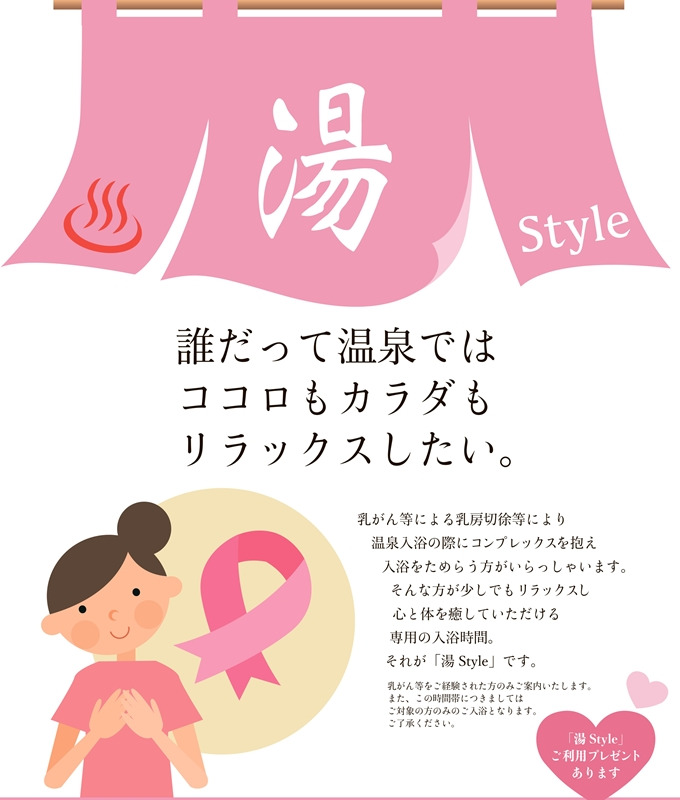 当ホテルでも10月22日11時~12時、鹿児島相互信用金庫の特別プロジェクト「そうしん 西郷団地ブレーン21」の主催で、乳がん等による乳房切除等を受けた方にリラックスしていただく温泉入浴イベント「湯 Style」が催され、当ホテルも協賛いたしました。