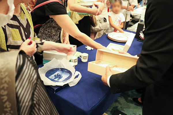会場となったエメラルドでは、会場をぐるっと一回りするように、100円、300円、500円、1000円のコーナーを設置。それぞれ使用済みの食器やグラスが大量に並べられたり箱積みされ、お客様が気に入った商品を手に取り、それぞれの担当スタッフのもとで清算。購入した品はお客様自ら新聞紙で包み、持参のマイバッグやダンボールなどに入れてお持ち帰り。会場でも持ち帰り用に、ホテルの袋と段ボールが販売されていました。