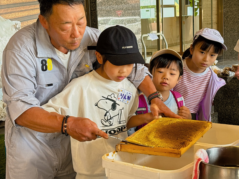 養蜂家さんから「みつばちの不思議」について学び、採蜜体験やオリジナルキャンドル作り体験、スイーツ作り体験をしました。