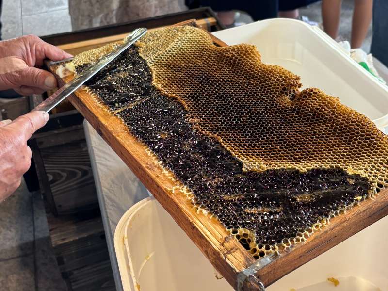 スムーズに切るのが難しく、コツがいるので養蜂家さんに レクチャーいただきながら作業を進めていきます。
