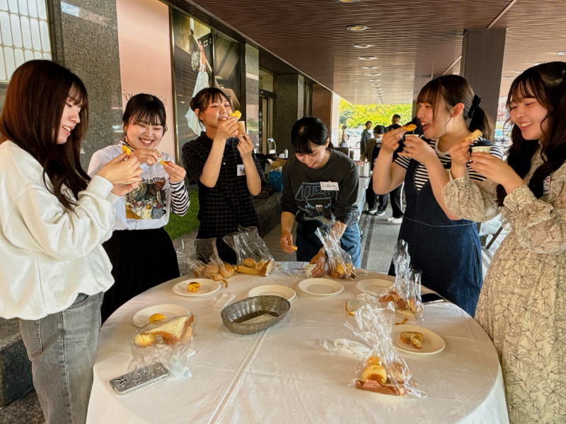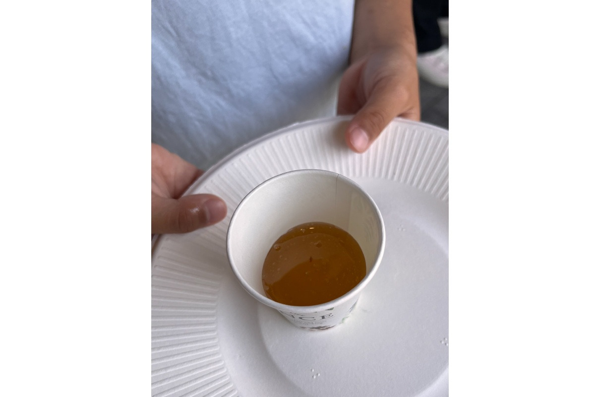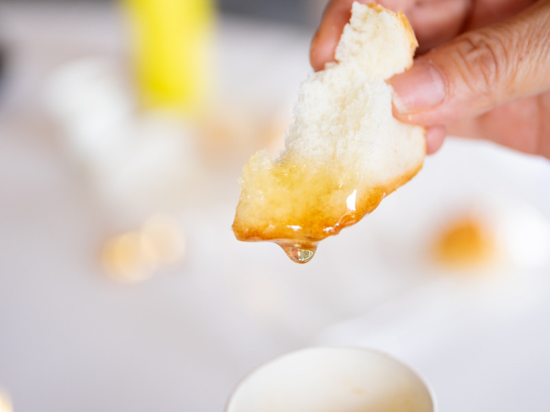 採れたばかりのハチミツを城山ベーカリーのパンにつけて試食。