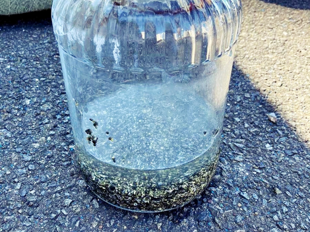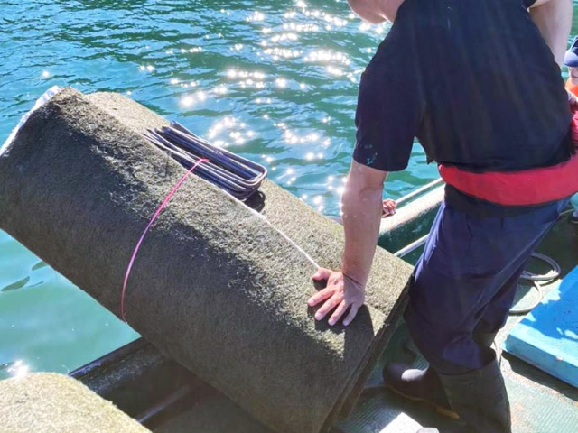 第1歩として、昨年秋に漁港近くの約5,000㎡を仕切り網で囲い、その一部に種をまいたマット20枚を設置しました。