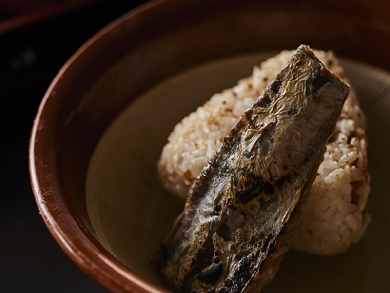 腹皮は鰹節を作る過程で不要な部位として切り落とされたもの。枕崎では古くから食されており、炙る程度に軽く塩焼きするのが一般的ですが、水簾では塩焼きをほぐして香ばしい焼きおにぎりにのせました。仕上げに、滋味深い鰹の出汁をかけてお召し上がりください。