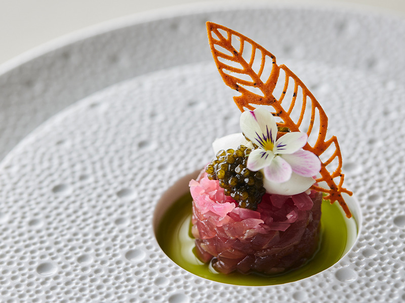サーモンやマグロを使うことの多いタルタルを、枕崎ぶえん鰹のもちもちっとした食感と旨みを引き出し仕上げました。鮮やかな赤に漆黒のキャビアをのせてエレガントに。サワークリームを添えて、鰹の生命力を爽やかに引き立てます。