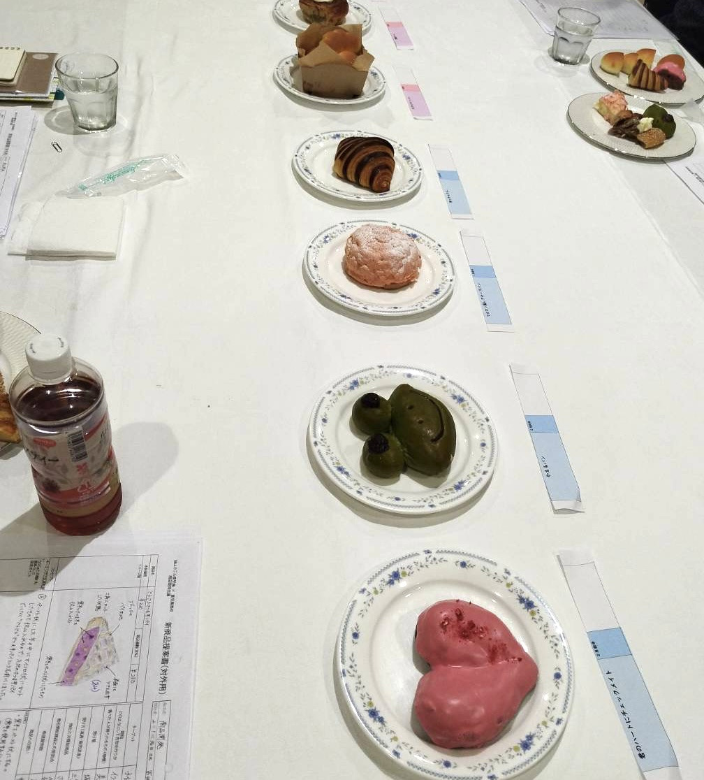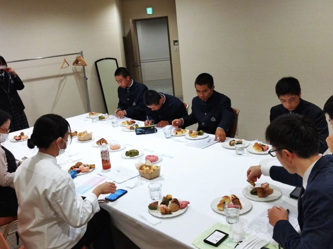 1つずつ商品を真剣に試食する生徒さんたち。実際に試食してみて、もっとこうしたらおいしくなるかも、楽しいパンになるかも!と意見を出し合います