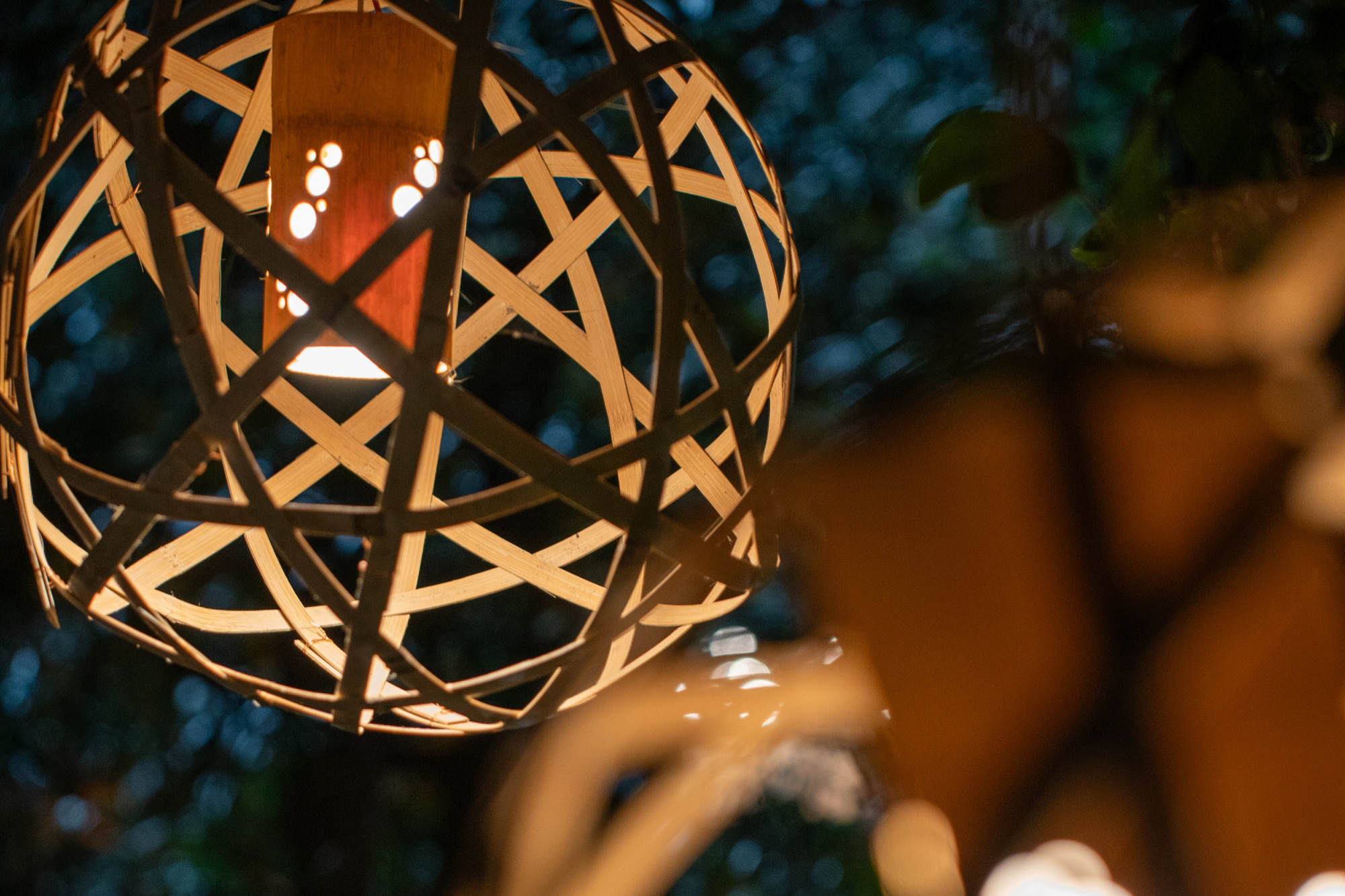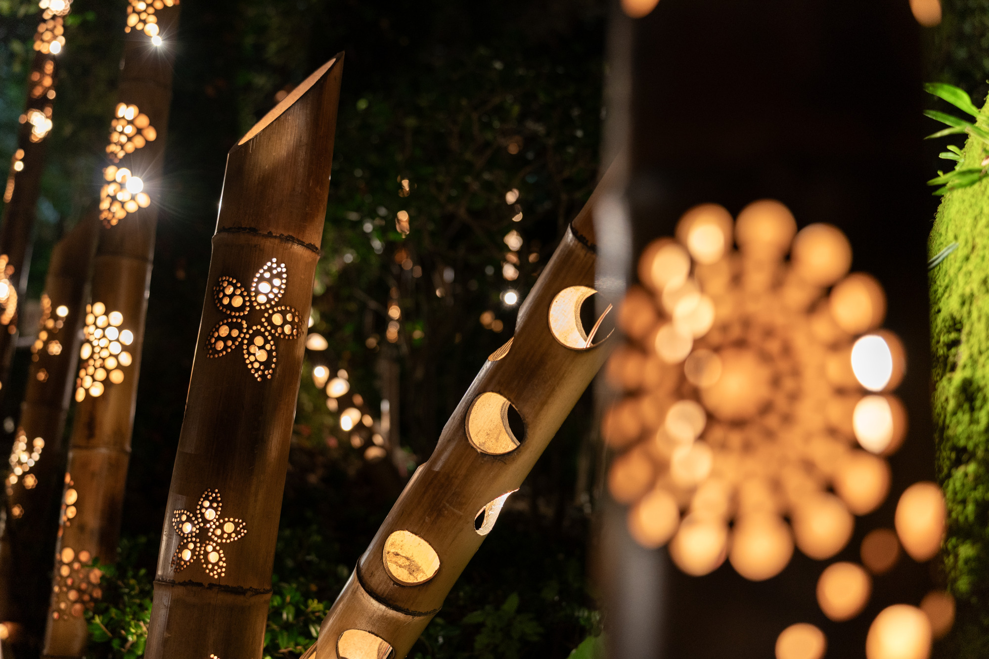 竹をくり抜いた模様からこぼれる灯りや、竹を編んだ竹ボールライトなど、ひとつひとつに温かみがあるのが竹灯籠の魅力。