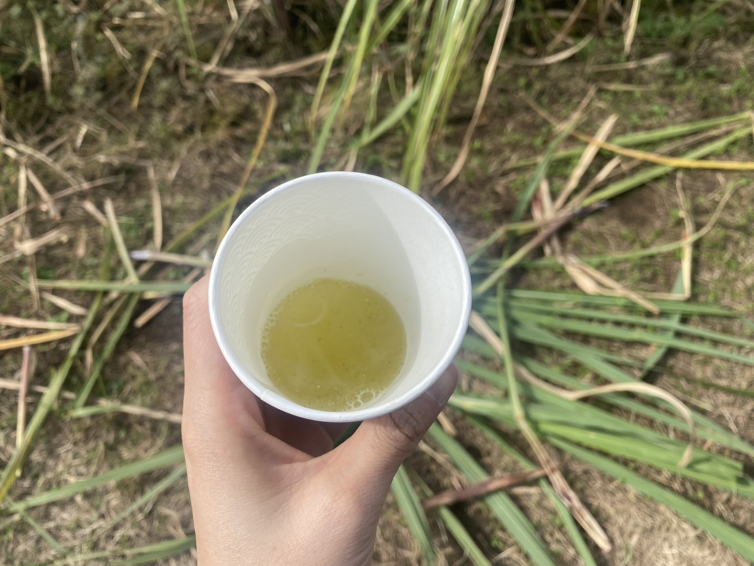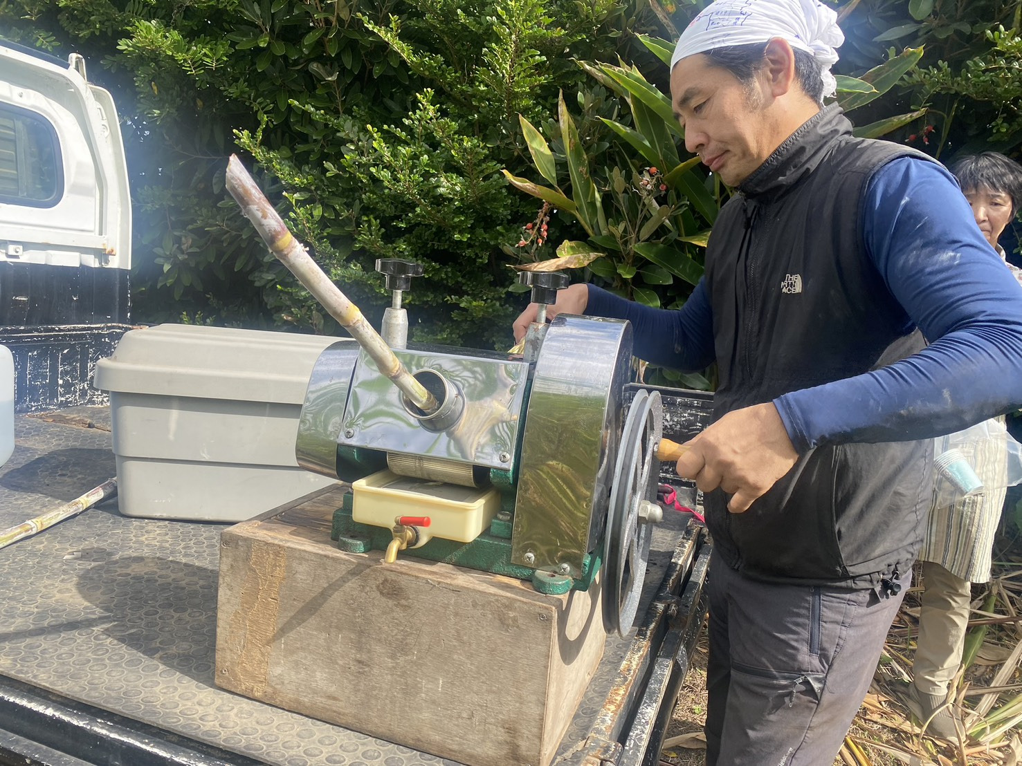実際にサトウキビを収穫し、その場で生のサトウキビジュースを絞って試飲させてもらいました。
