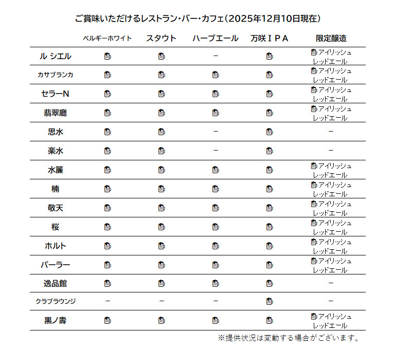 城山ブルワリーは、各レストラン、Souvenir Shop Shiroyama 逸品館でお飲みいただけます。*工場ではお飲みいただけません。