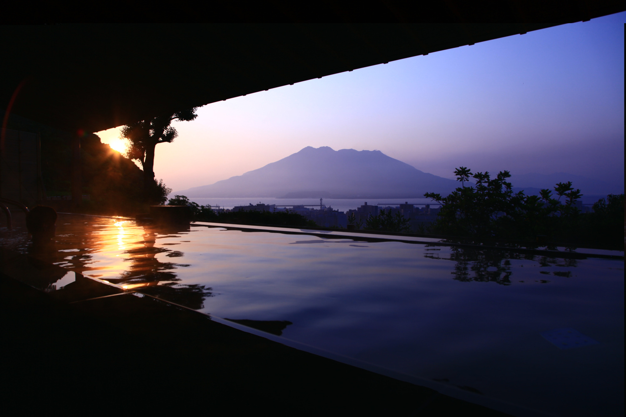 地下1,000mから湧き出る良質な温泉「さつま乃湯」は、炭酸水素塩泉の“美人の湯”として評判。皮脂を乳化し肌の汚れを落としやすくする成分が含まれ、お肌をつるつるに。内湯は温度を低めに設定しているため、長湯しながら桜島や市街地の絶景をゆったり楽しめます。特におすすめは、桜島から昇る朝日を眺めながらの朝風呂。毎日、日の出時刻をお知らせしてくれるので、最高のタイミングで絶景風呂に浸れます。入浴後には、無料提供の城山の地下水でのどを潤しましょう。湯上がりの体にやさしく染みわたります。