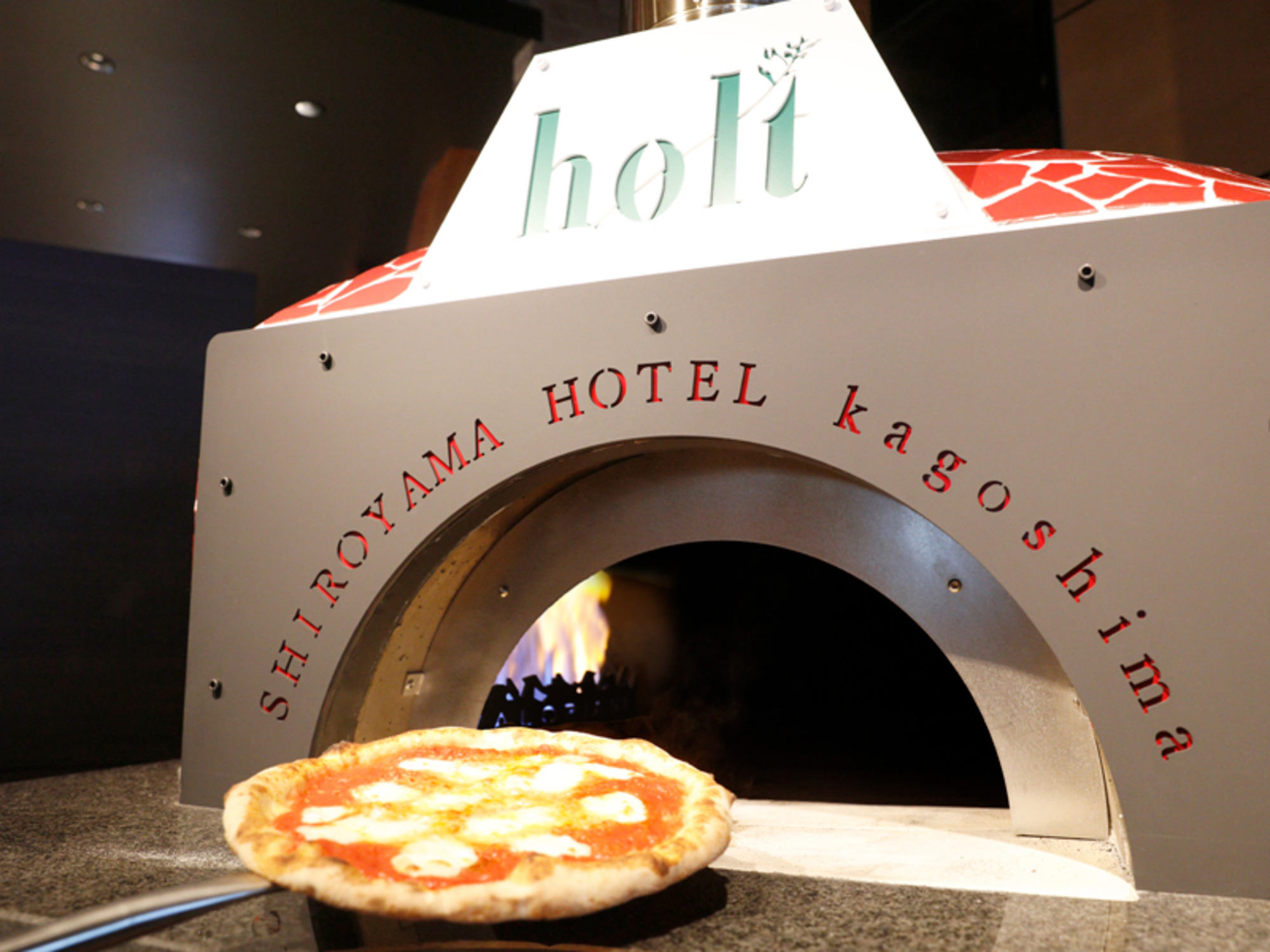 1日たっぷり遊んで、お風呂でさっぱりしたら、いよいよお待ちかねのディナータイム。向かうのはホテル内のイタリアンレストラン「イタリアン ホルト」。石窯で焼き上げるアツアツのピザに、旬の料理がずらりと並ぶビュッフェは、子どもも大人も大満足!窓の外には鹿児島市街地の美しい夜景が広がります。