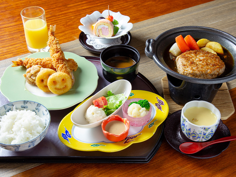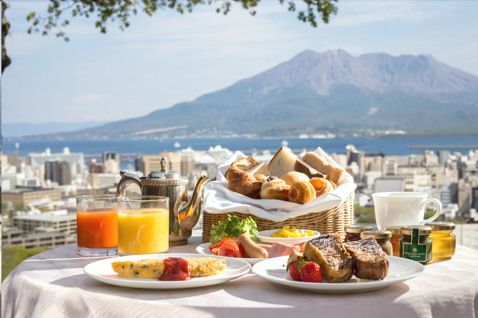 朝食は、地元の旬の食材をふんだんに使用した約80種類の和・洋ビュッフェを楽しみましょう!定番の朝ごはんや郷土料理はもちろん、ホテルメイドのさつまあげやベーカリー、お土産でも人気の「鰹節卵かけご飯」「鯛茶漬け」などのオリジナル料理も楽しめます。家族みんなが満足できるラインナップが揃い、お子様向けのメニューも豊富です。朝から桜島を眺めながら、贅沢な朝ごはんタイムになること間違いなしです!