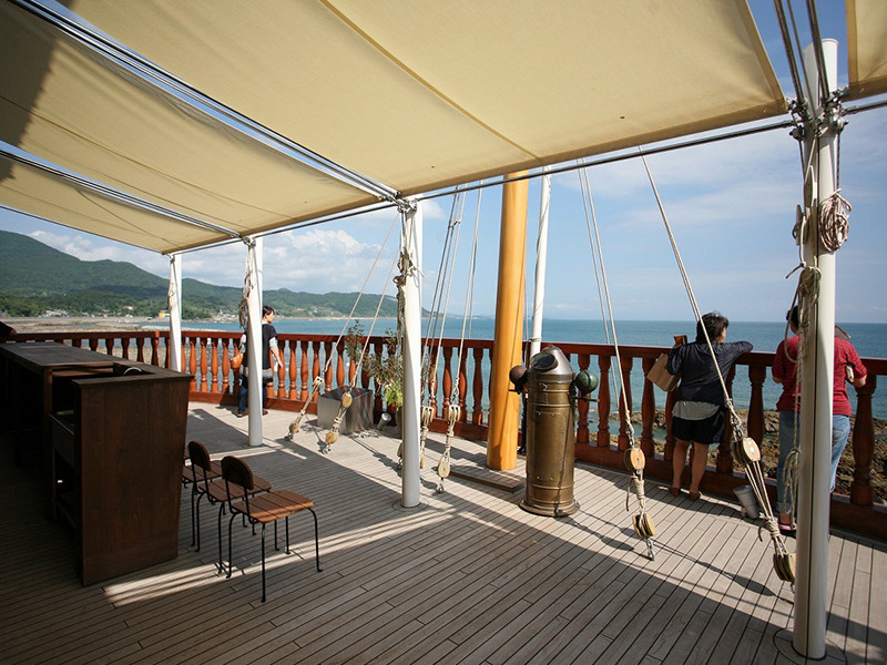 記念館内のカフェでは、海が見えるテラスでランチが楽しめます。