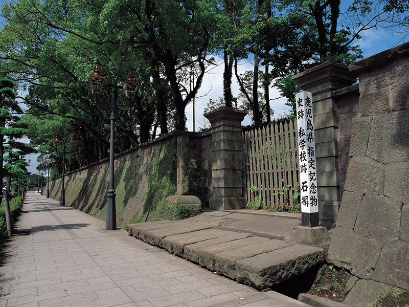 西南戦争の際には私学校の石垣に多くの銃弾が撃ち込まれ、今なお激戦の様子を伝えています。