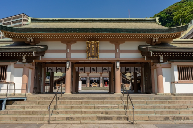入口にある大鳥居は1928年の御大典を記念して建てられたもので、19.8mの高さがあり、初詣や六月灯には多くの参拝客で賑わいます。