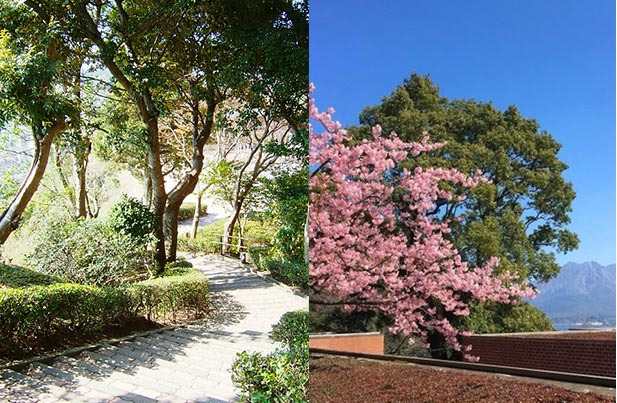 眼下には桜島、錦江湾、鹿児島市街地が広がっています。また、自然と眺望を楽しみながら開放感たっぷりの挙式場・ガーデンチャペルとしても人気のスポットです。
