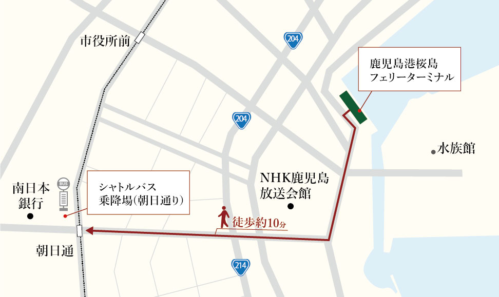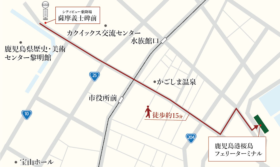 徒歩(約10分)、カゴシマシティビューバス 桜州小学校前バス停~桜島港前バス停(約5分)