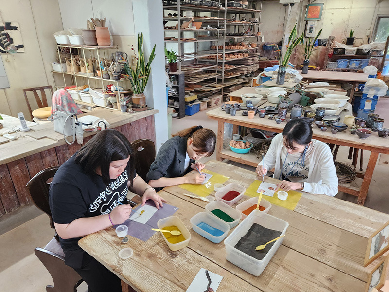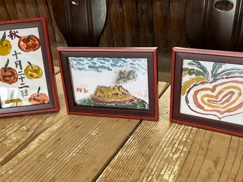 桜島の火山灰を使用した『サンドアート』色とりどりの火山灰で絵をかいてみませんか。のりをつけた用紙に火山灰を振りかけていくだけで、世界に一つだけの作品がお作りいただけます。是非匂いを感じながら、手で触れてお楽しみください。