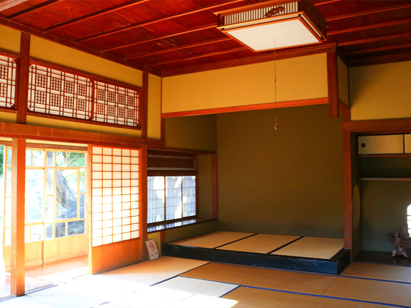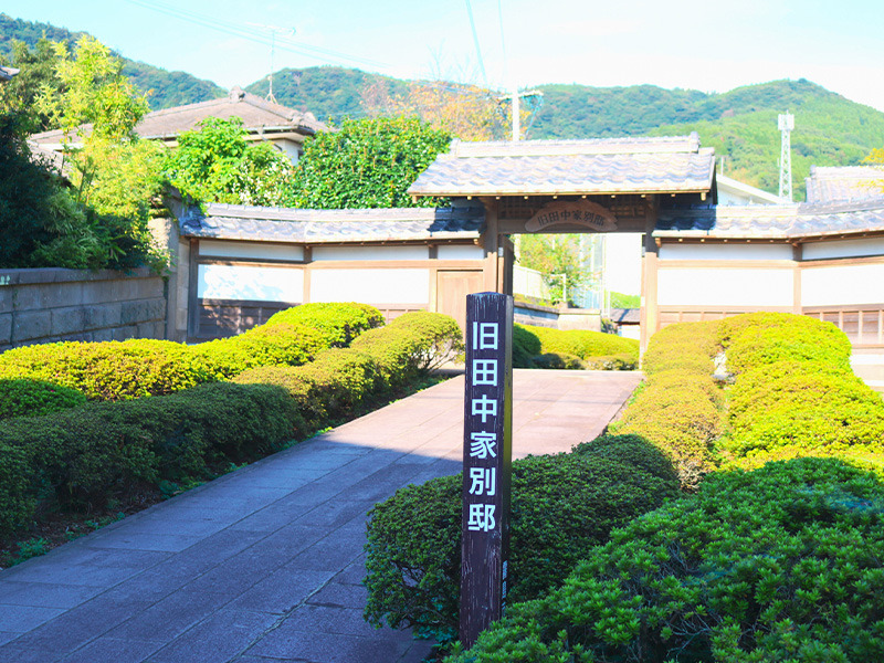 海運業で財を成し、私立福山中学校を故郷に創立した実業家、田中省三氏が建造したもので、大正11年に完成しました。阪神方面から技師や職人を招き、また建築材料も運んで、高価な特殊材料がふんだんに使われています。現在は、県の文化財に指定されています。また、別邸とともに建造された桜島を望む庭園は、市の文化財に指定されています。