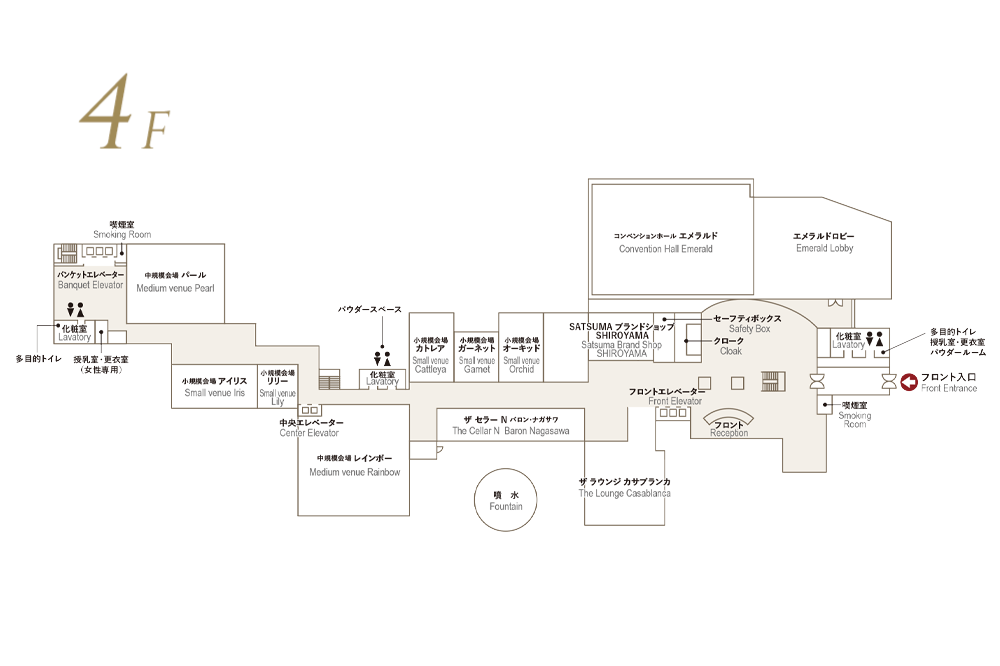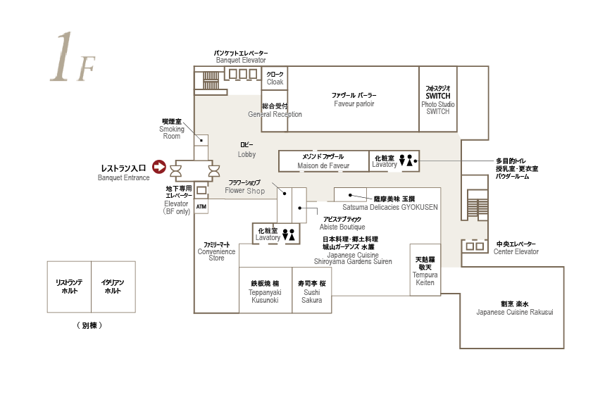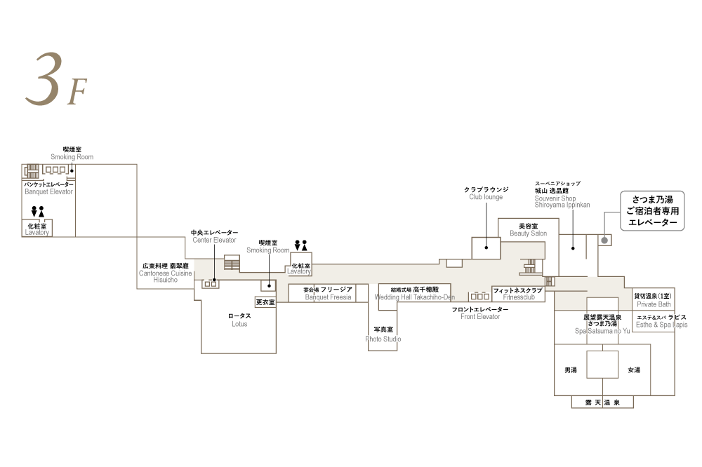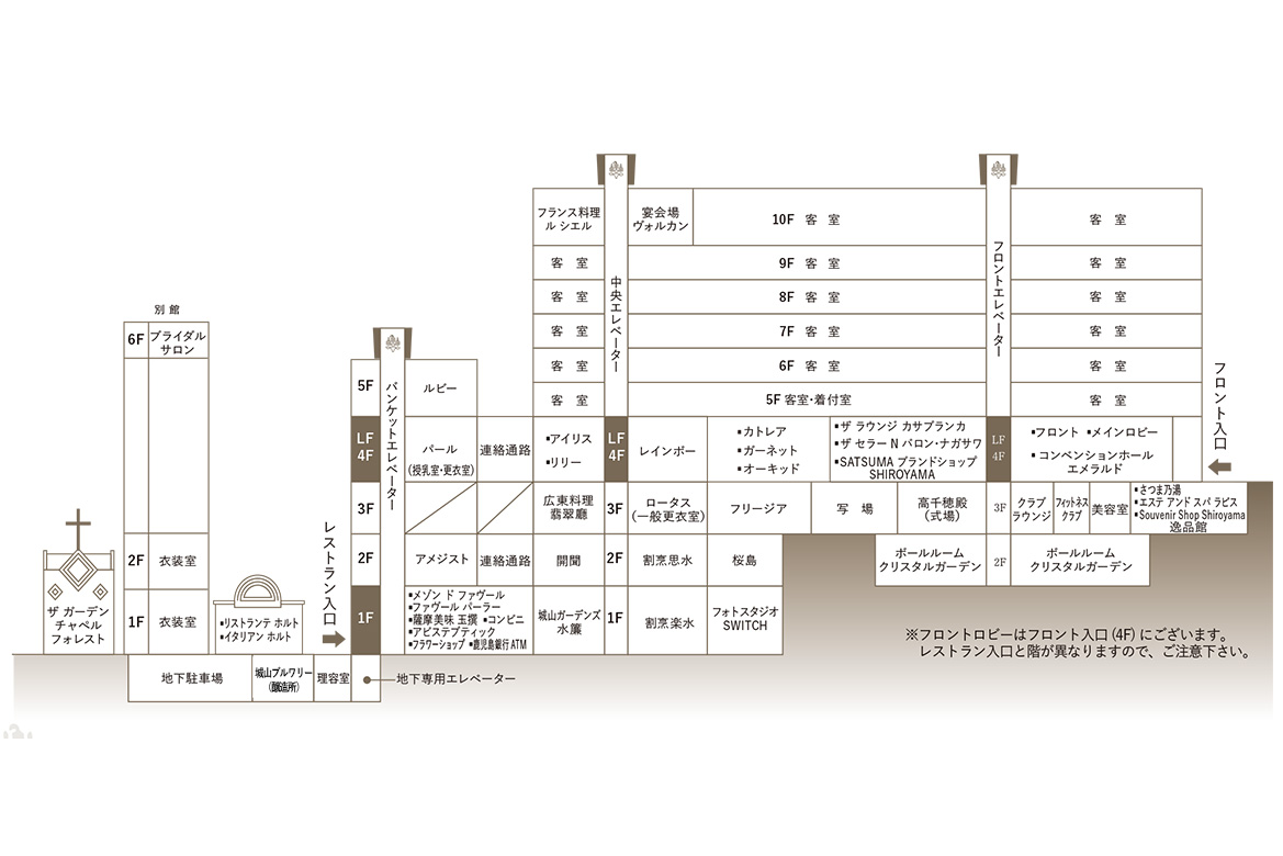 | 館内施設 | レストラン、宴会・会議場、温泉、エステ、ショップ、コンビニ、ATM、駐車場、理容室・美容室、城山ブルワリー |