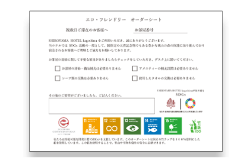 客室にエコフレンドリーオーダーフォームを設置し、不要なクリーニング、備品の交換を減らす取り組み。