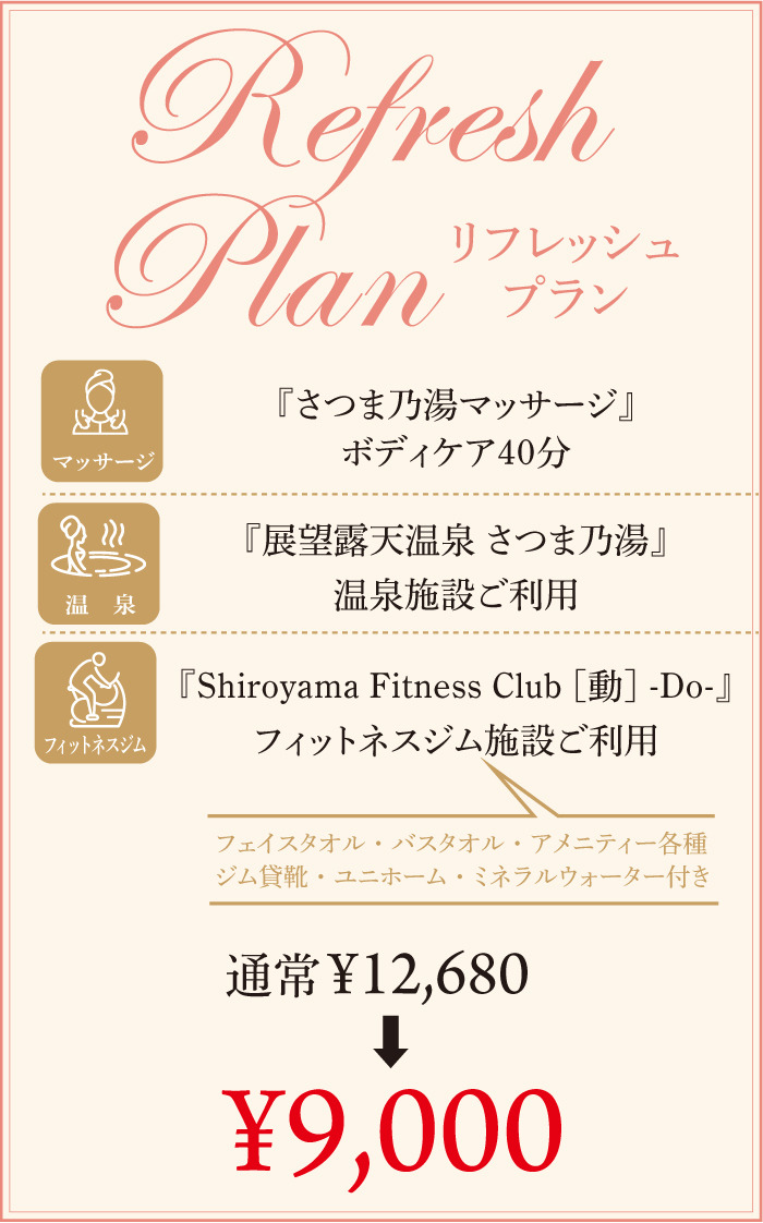 「展望露天温泉 さつま乃湯」「さつま乃湯ボディケア」「フィットネスクラブ」をご利用いただけます。