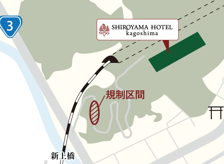 この度、当ホテルへ通じる新照院側市道におきまして、法面工事の実施に伴い、一時的に交通規制が行われます。