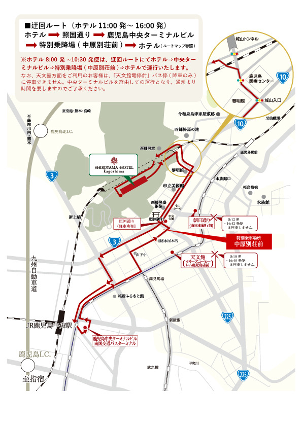 ※ホテル7:30発~16:00発便は、天文館・朝日通りバス停には停車できません。中原別荘前にてご乗車ください。