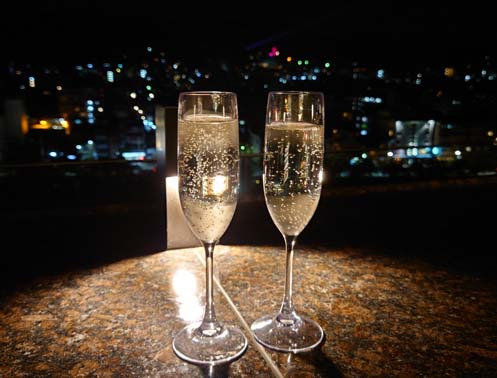 桜島を望むホテルテラスで優雅にシャンパーニュを
