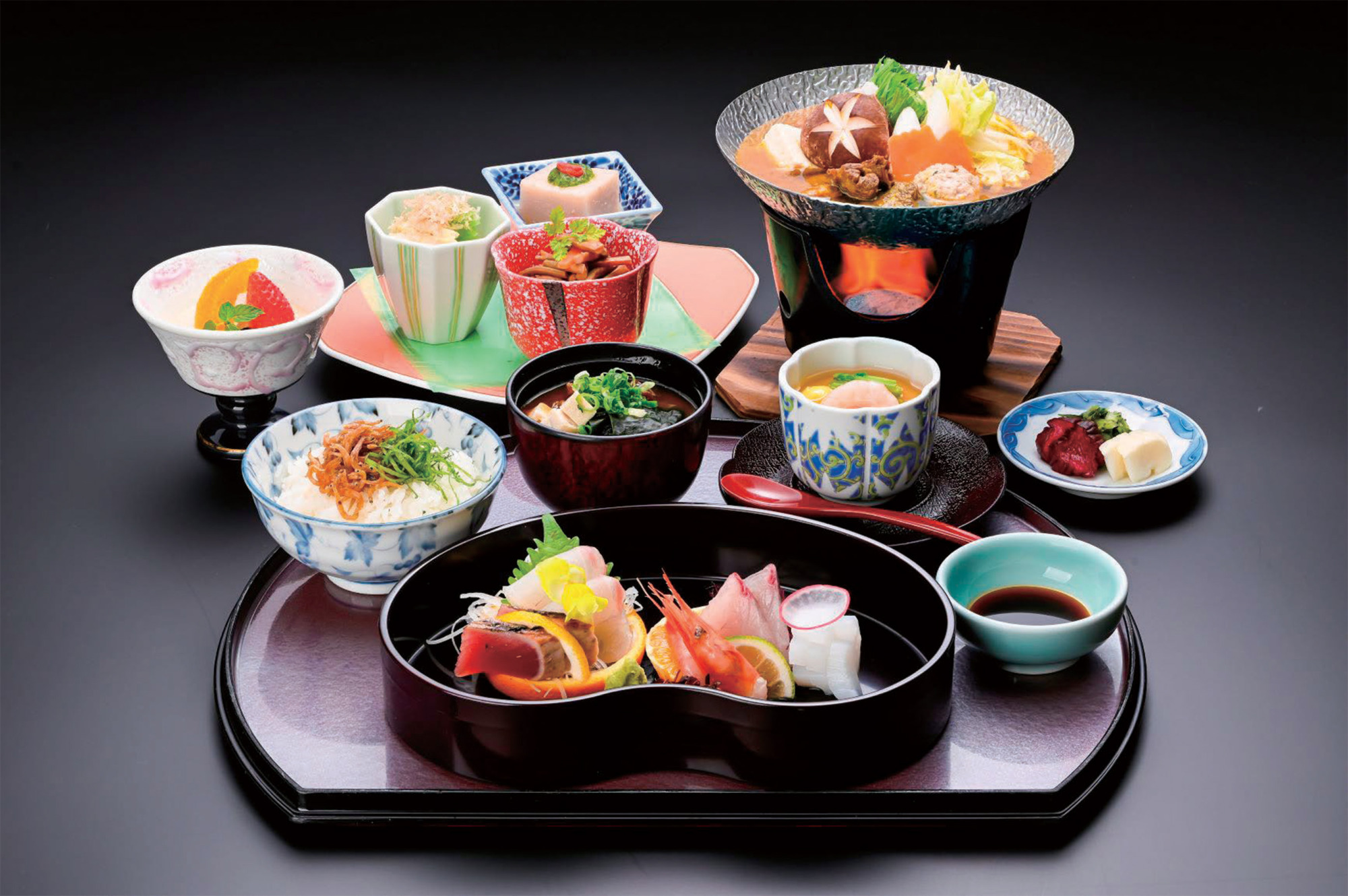 ・小鉢・造り・煮物・あら炊き・黒豚鍋・御飯・香物・留椀・デザート