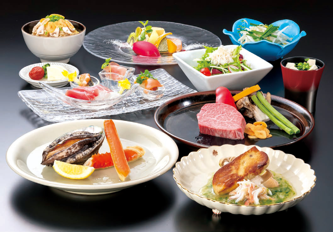 前菜、フォアグラ、ズワイガニ、鮑、サラダ、ステーキ(80g)、焼野菜、御飯、香物、味噌椀、デザート、コーヒー