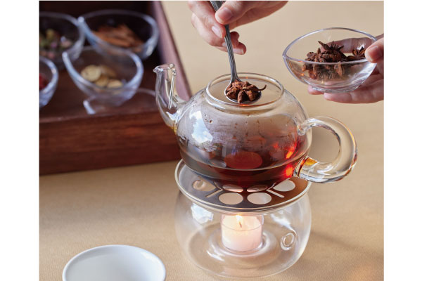中華料理と相性の良い漢方をブレンドし、目の前で仕上げをいたします。ベースの八宝茶に漢方を追加してお好みのお茶に仕立てすることも可能です。
