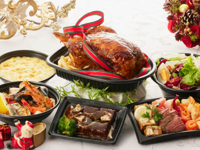 ・ローストチキン・ビーフシチュー・魚介とショートパスタのグラタン ・オードブル5種・シーザー風サラダ・魚介のパエリア