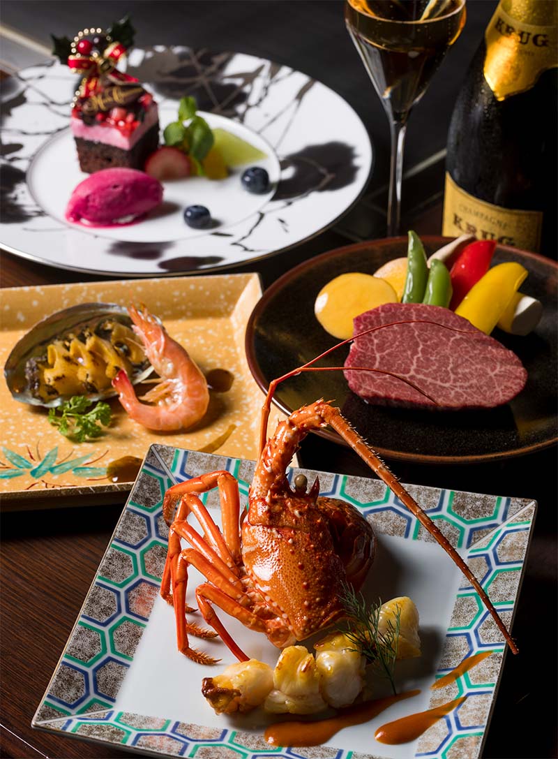 【B】フォアグラの茶わん蒸し、伊勢海老のグリル、活き鮑、鹿児島黒毛和牛ヒレ、クリスマスデザート など