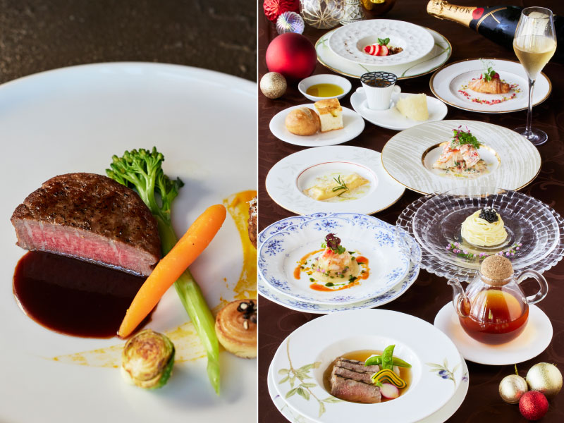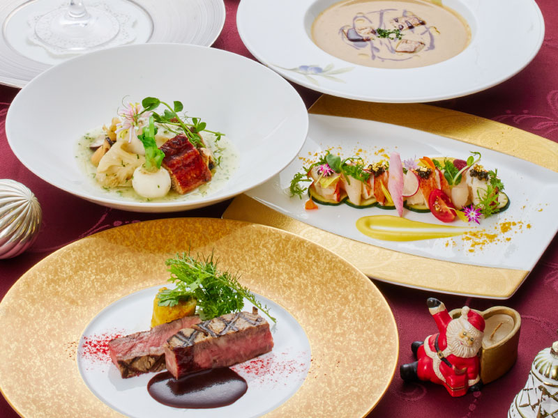 〈メニュー〉 前菜盛り合わせ、キノコのポタージュ、 鹿児島産アラのグリル、 鹿児島産黒毛和牛ヒレ肉の炙り焼き、 クリスマスデザート、コーヒー又は紅茶