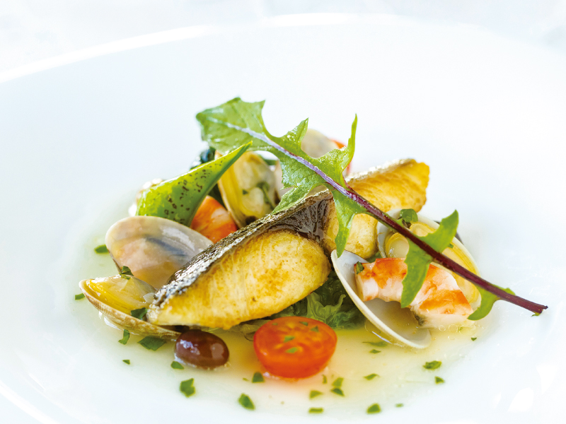 〔MENU〕サーモンとカンパチのロトロ 2種のピーマンピューレ 桜島小みかんドレッシング / 牛肉とポルチーニ茸のラグー 和えパスタ / 真鯛のアクアパッツァ / 牛肉の煮込みペポーゾ風 ポテトピューレ添え / 本日のデザート / パン