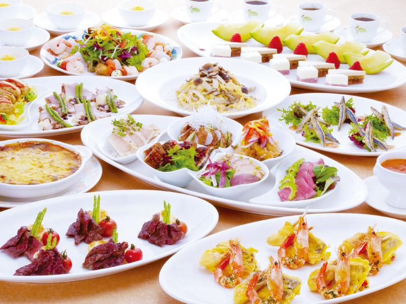 〔MENU〕 オードブル3種 / 本日のスパゲティ / 赤魚と海老のソテー ドライトマト入りクリームソース / ピザ / ローストビーフ温野菜添え / デザートフルーツ盛合せ / 食後のお飲み物