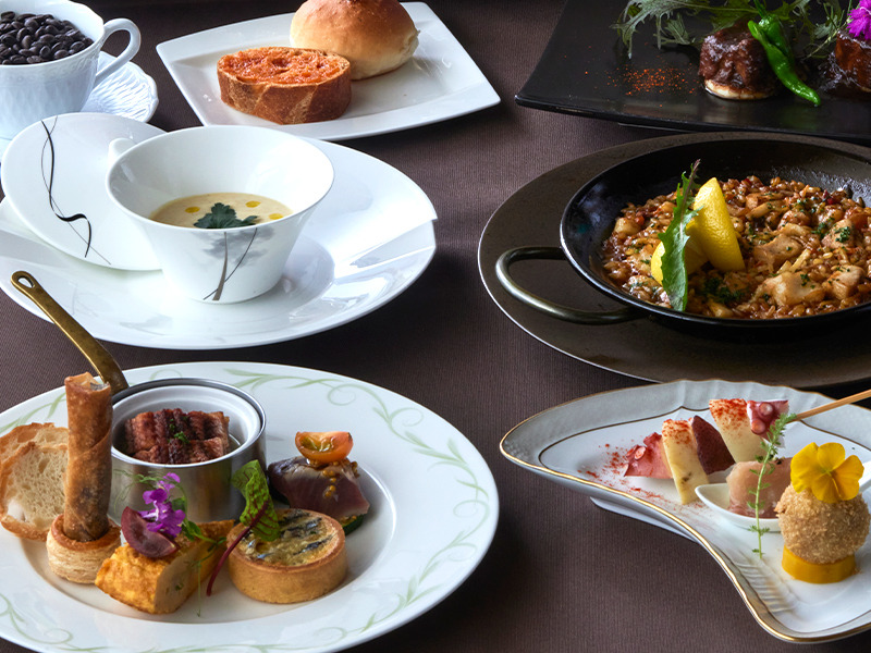 イブニングハイティ | ■ハイティ 〈上段〉ピザパン ミニハンバーガー スパイス風味ポテト 〈中段〉鶏肉と野菜の冷たいポトフ ブリの和風焼き スモークサーモン チーズ3種 〈下段〉ローストビーフのサラダ仕立て ■別プレート 真鯛・鰻・エビ・茸のパエリア ■本日のデザート |