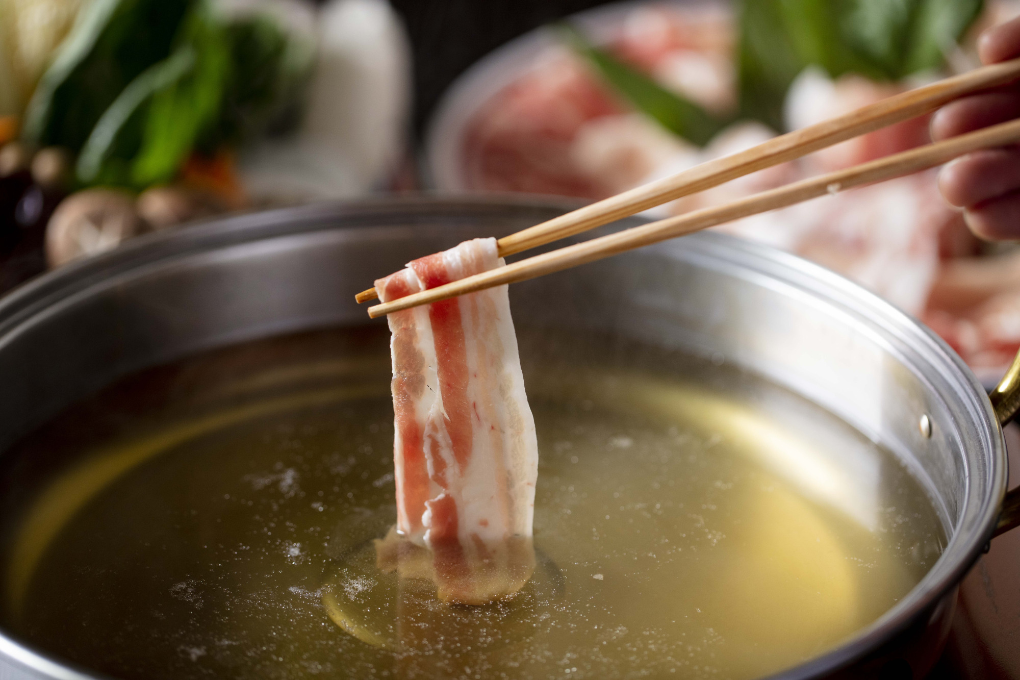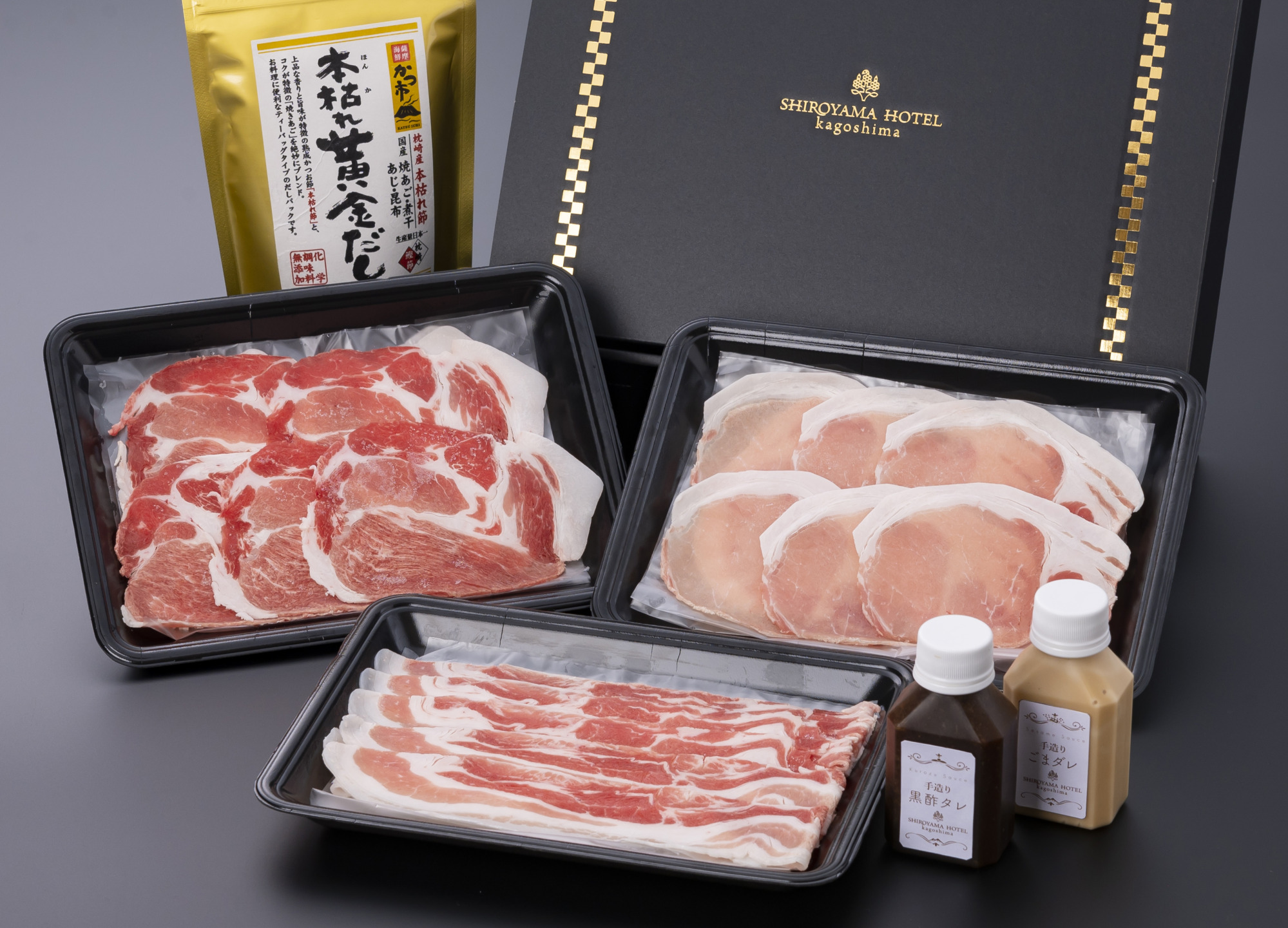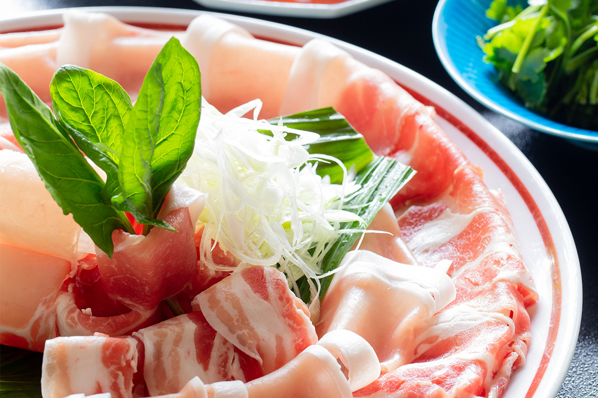厳格ルールのもと生産、飼育管理された黒豚「かごしま黒豚さつま」を使用しています。上品な香りと旨味が特徴の熟成かつお節「本枯れ節」と、コクが特徴の「焼あご」を絶妙にブレンドした「本枯れ黄金だし」、そしてホテル特製の「ごまだれ」「黒酢だれ」をご用意致しました。2種類のタレで「かごしま黒豚さつま」のしゃぶしゃぶをご堪能ください。