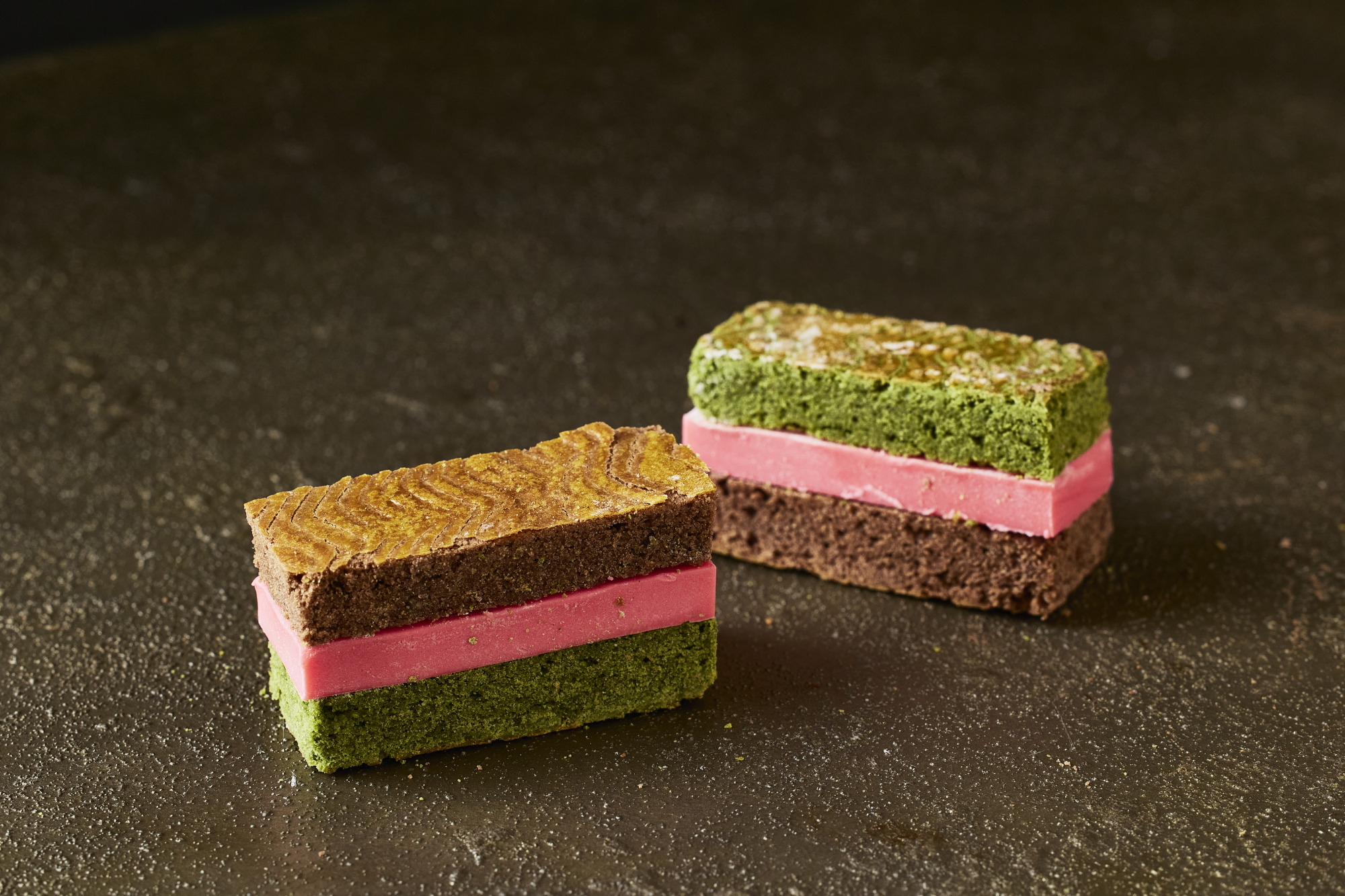 イチゴ風味のホワイトチョコを抹茶とココアのサブレでサンドした食感の楽しいクッキーです。