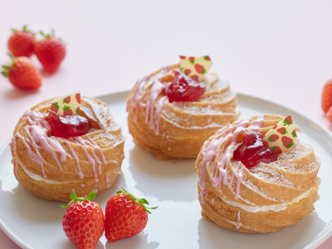 空気をたっぷり含ませて焼き上げた、ふわっと軽いフレンチクルーラー生地が主役。中にはなめらかなホイップクリームを忍ばせ、仕上げに甘酸っぱい いちごソースをトッピングしました。 とろけるような口どけの良さと、いちごの爽やかな余韻をお楽しみください。