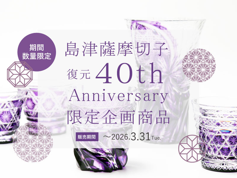 薩摩切子復元40周年を迎えた今年は、「島津紫」誕生20周年の年でもあります。薩摩切子の生みの親である島津斉彬は、紫色にひとかたならぬ思いがあったそうです。斉彬の夢を託す意味を込めて名付けられた” 島津紫” は鮮やかで濁りのない、 格式と伝統を感じさせるこだわりの色です。