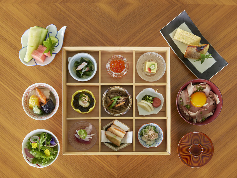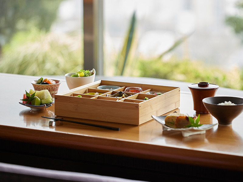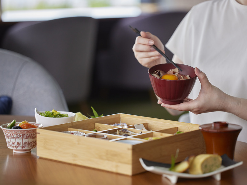 三面ガラス張りの開放的なラウンジで、鹿児島の季節の彩を詰め込んだ朝食膳「城山彩箱」をご準備いたしました。